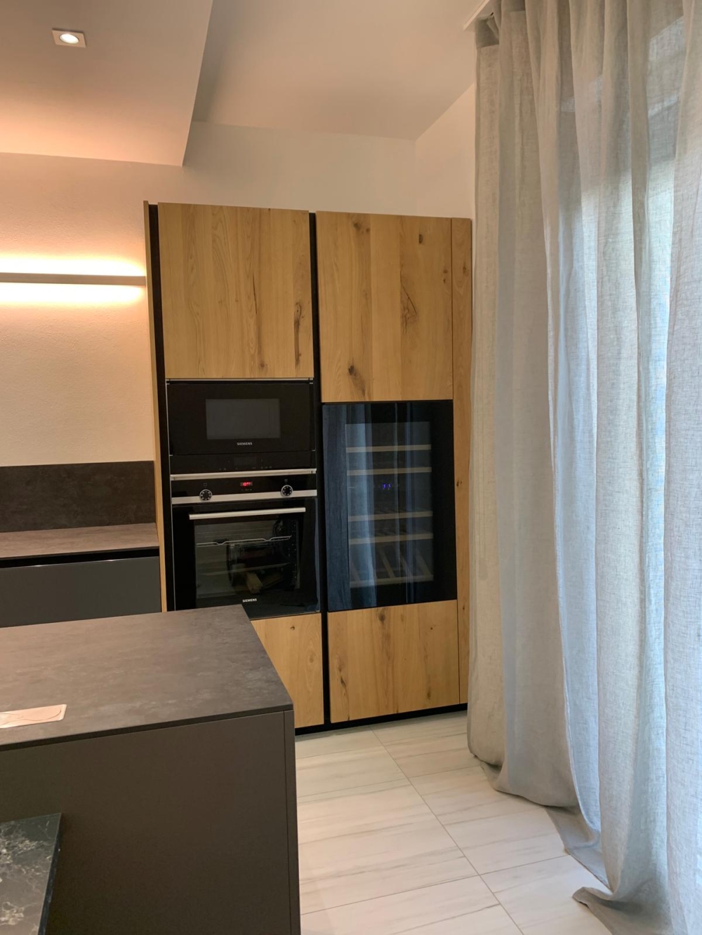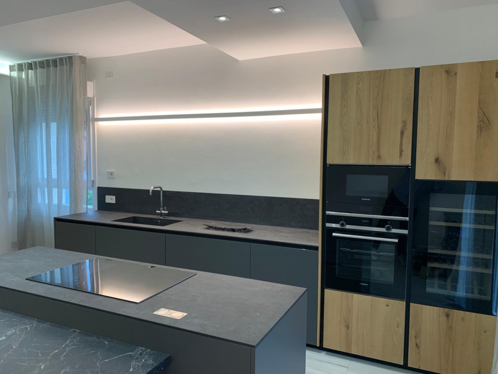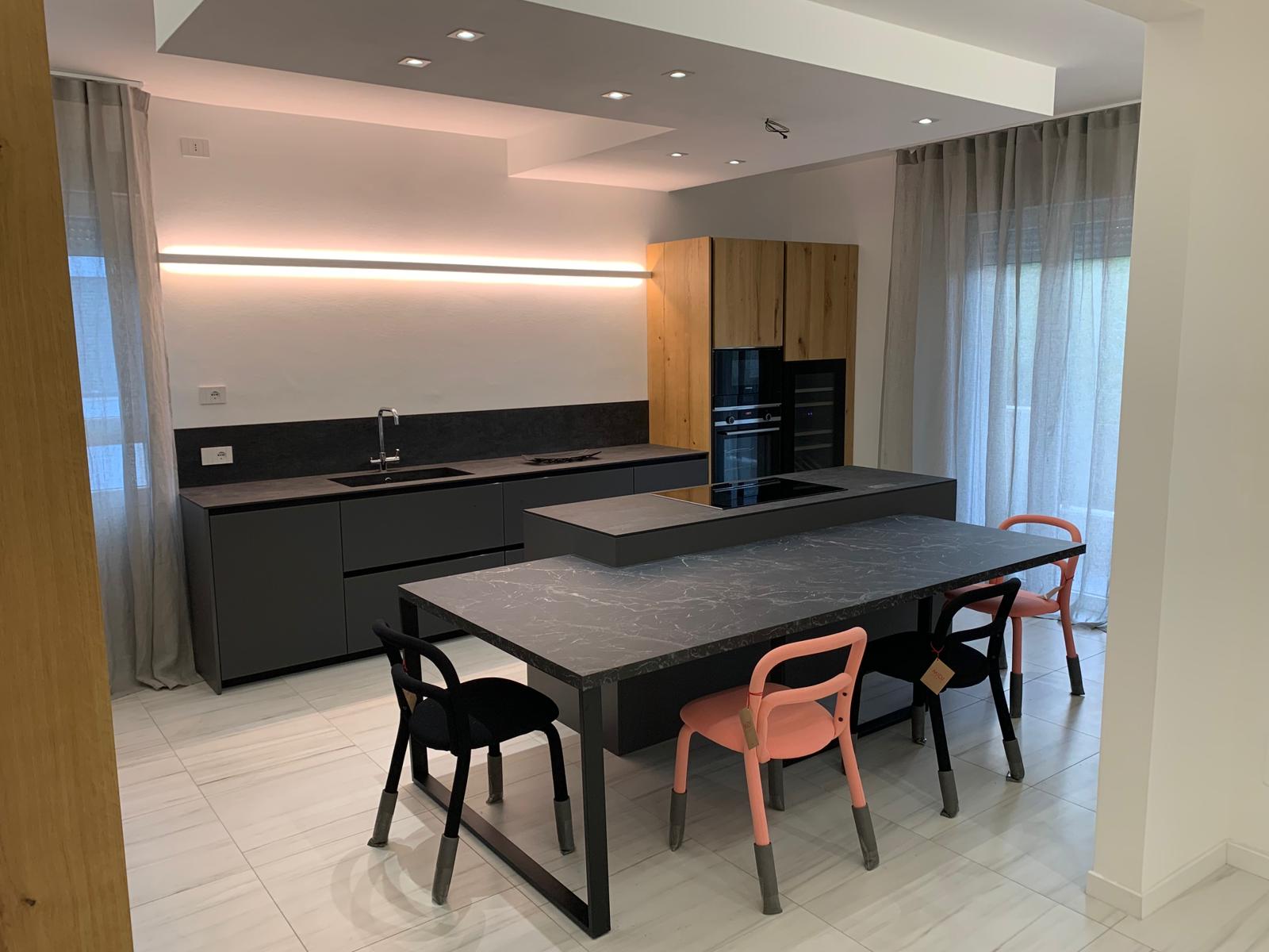 La zona cucina è un perfetto esempio di contrasti materici. Le colonne a tutta altezza con finitura in legno naturale offrono un tocco caldo e accogliente, affiancate da una parete attrezzata con ante in finitura opaca scura. L’isola centrale, dotata di piano cottura a induzione, prosegue in un tavolo da pranzo con lo stesso top scuro, creando un blocco unitario di grande impatto visivo.