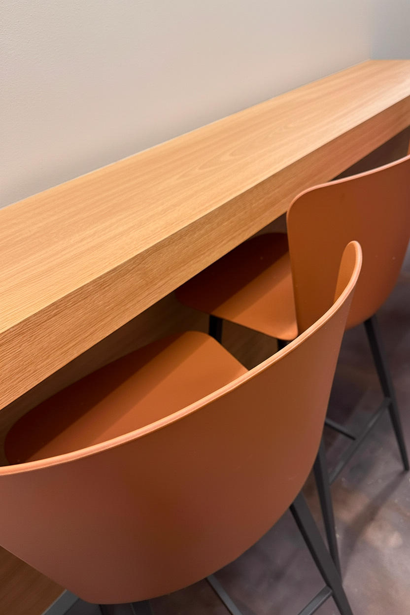 Il locale è stato arredato con sedute dal design essenziale, caratterizzate da tonalità calde che richiamano la natura, abbinate a tavoli dalle linee pulite con struttura in metallo e piano scuro. Un equilibrio di materiali e colori che trasmette calore e raffinatezza, creando un’atmosfera ideale per la socialità e la pausa gourmet.
