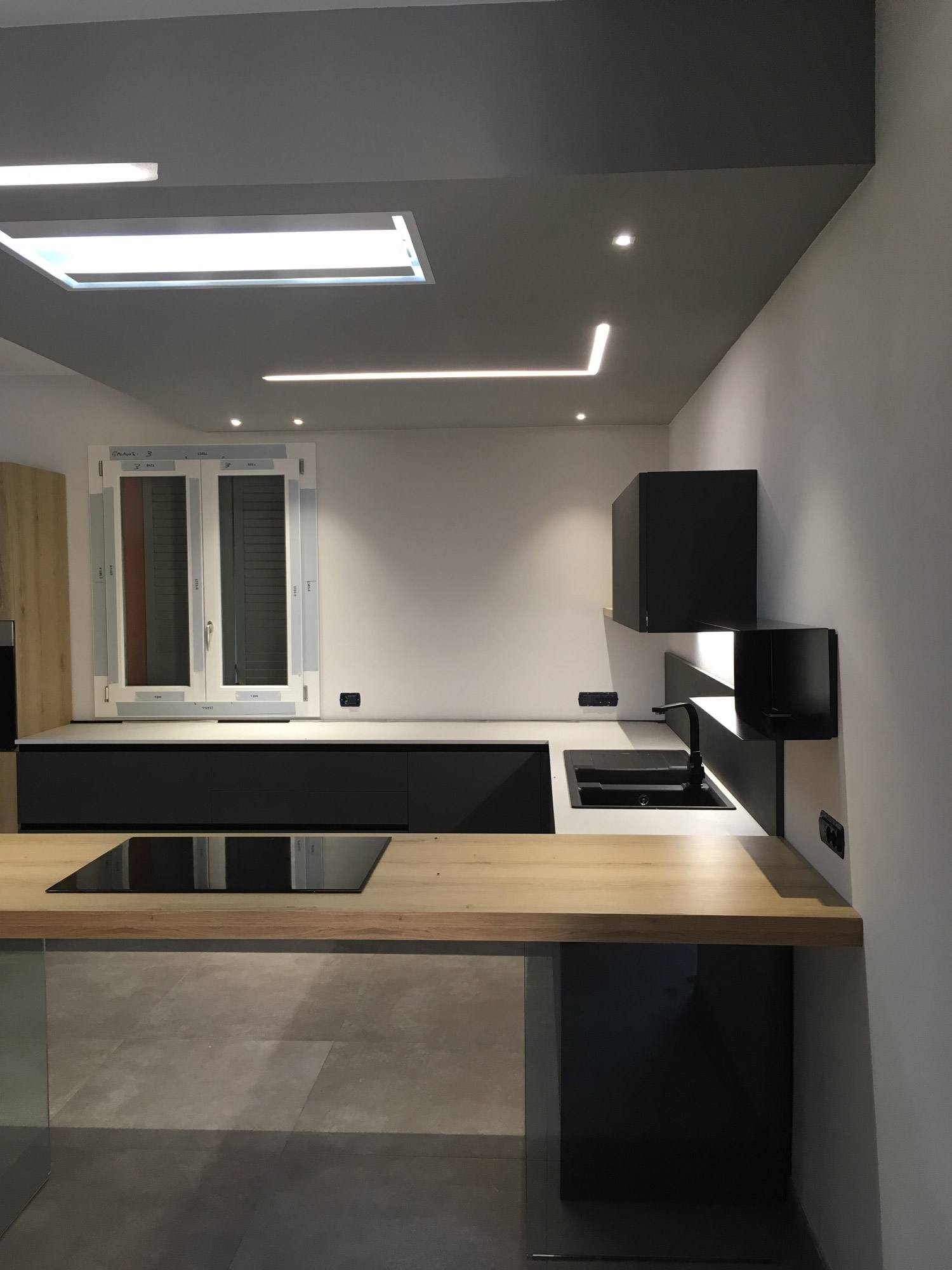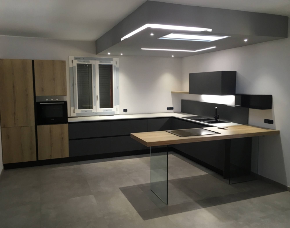 Abbiamo progettato e realizzato la nuova cucina di Rosa e Luca, con ante in resina carbone e rovere biondo. La cappa nuvola è stata inserita nel cartongesso e il piano induzione contestualizzato in penisola. Il progetto della cucina ha incluso anche la bellezza e la funzionalità dei cartongessi illuminanti, compresa la parete porta tv.