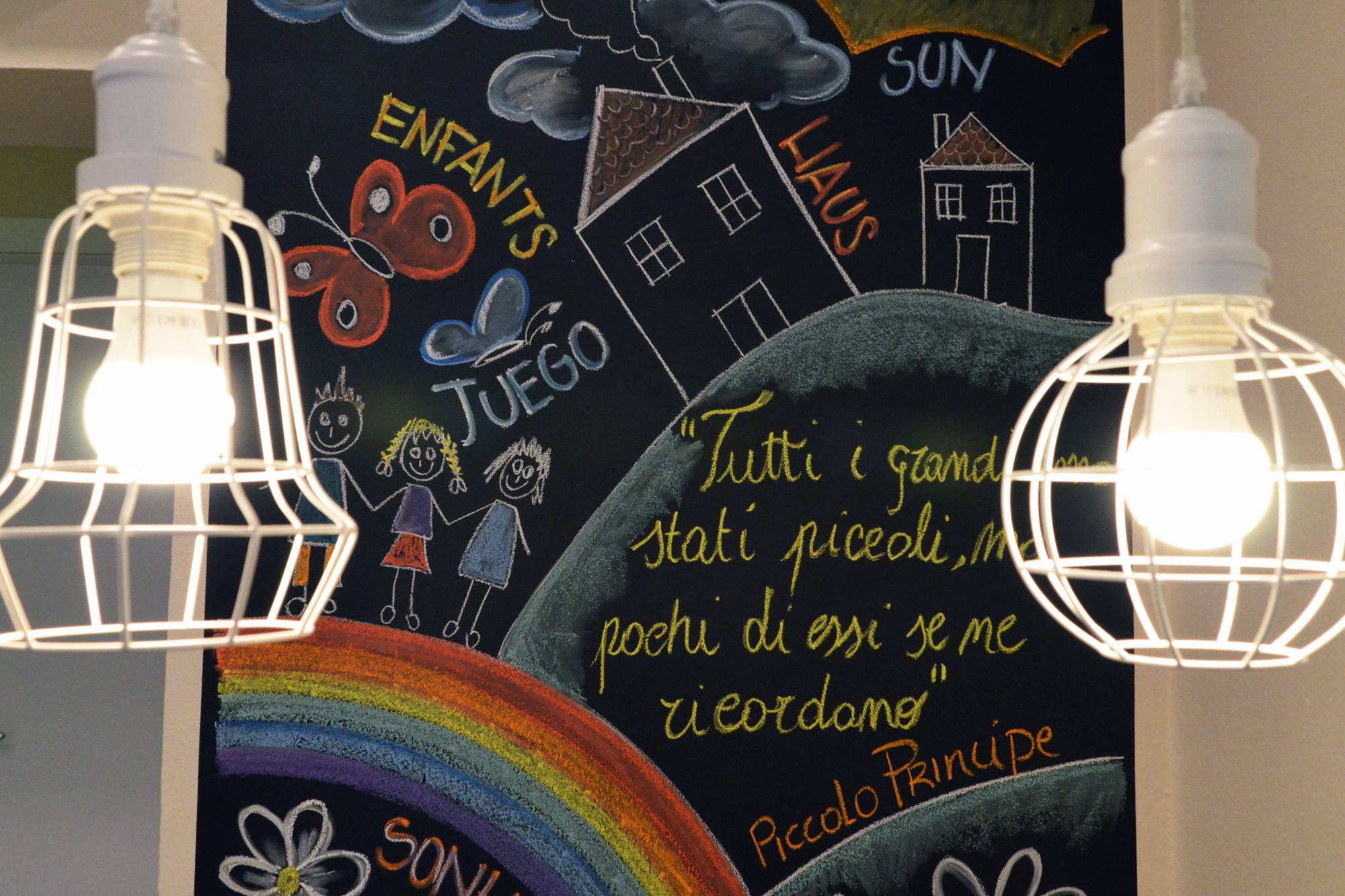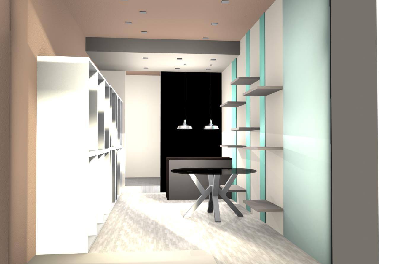 E’ stato entusiasmante progettare, arredare e seguire i lavori per creare il negozio Fashion Kids. Abbiamo pensato di illuminare il controsoffitto con preziosi faretti creando un design allegro ”zig zagando” nella disposizione. L’arredo bianco, la console effetto ruggine mettono in risalto la parete impreziosita dalle righe dalla cromia dei toni verdi. Gli spazi scaldati dall’atmosfera luminosa e rasserenante mettono in risalto i volumi del negozio. Il gradino segna la zona camerino di prova a sinistra, dietro al quale si affaccia una porta divisoria ”off limits” che porta all’amplio magazzino dove la proprietaria dispone tutta la merce in arrivo.