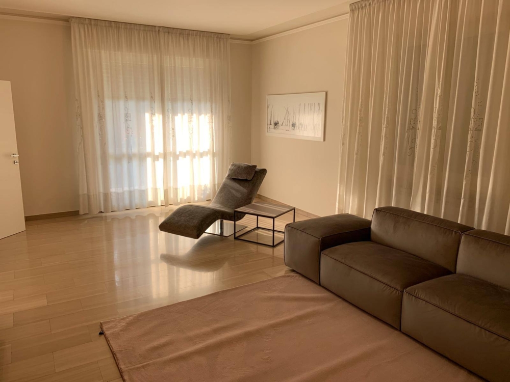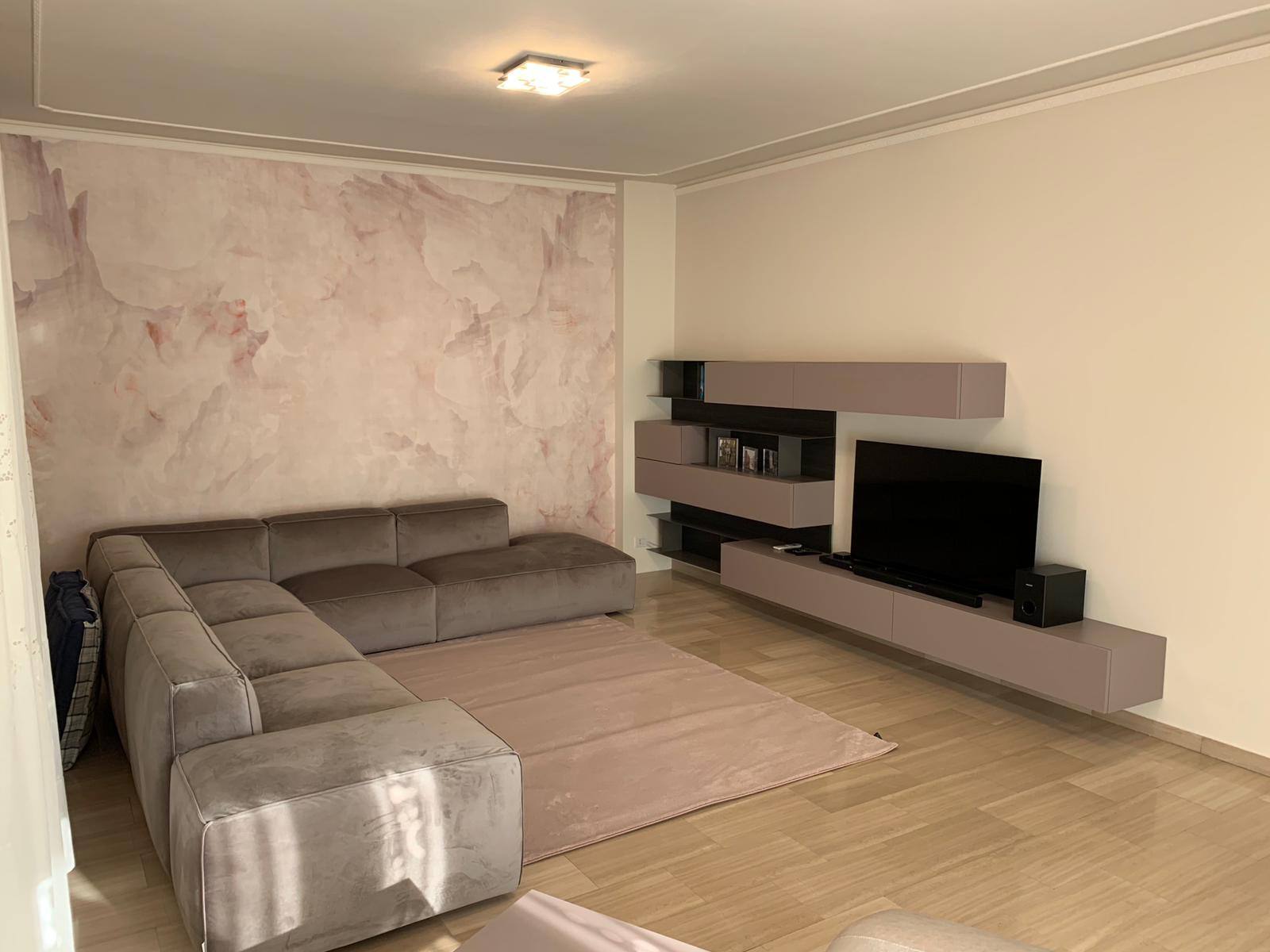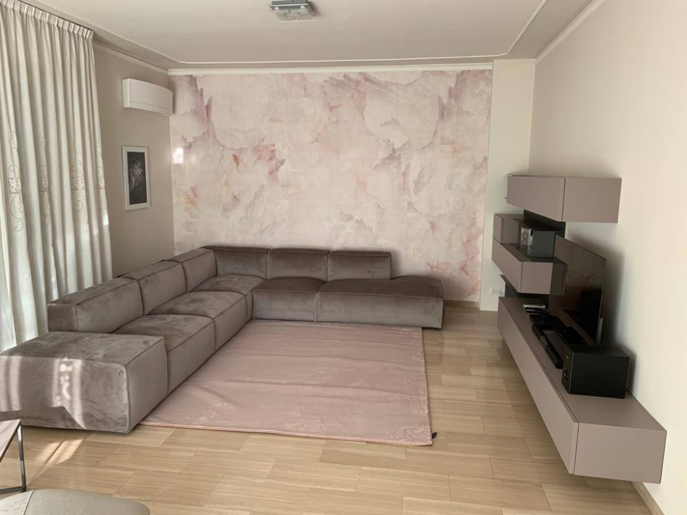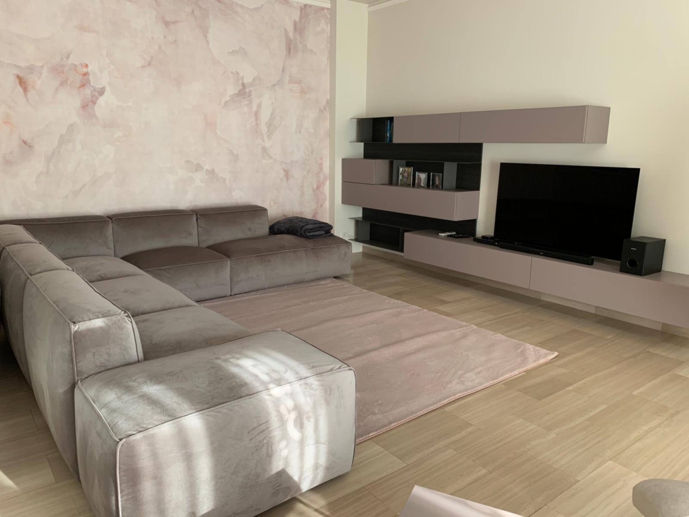 Elegante zona living caratterizzata dalla tonalità di color cipria e rosa antico.