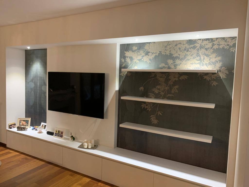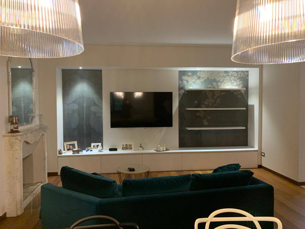 Un tocco originale, la carta da parati come decorazione per le nicchie nel living che rendono l’ambiente ancora più elegante.